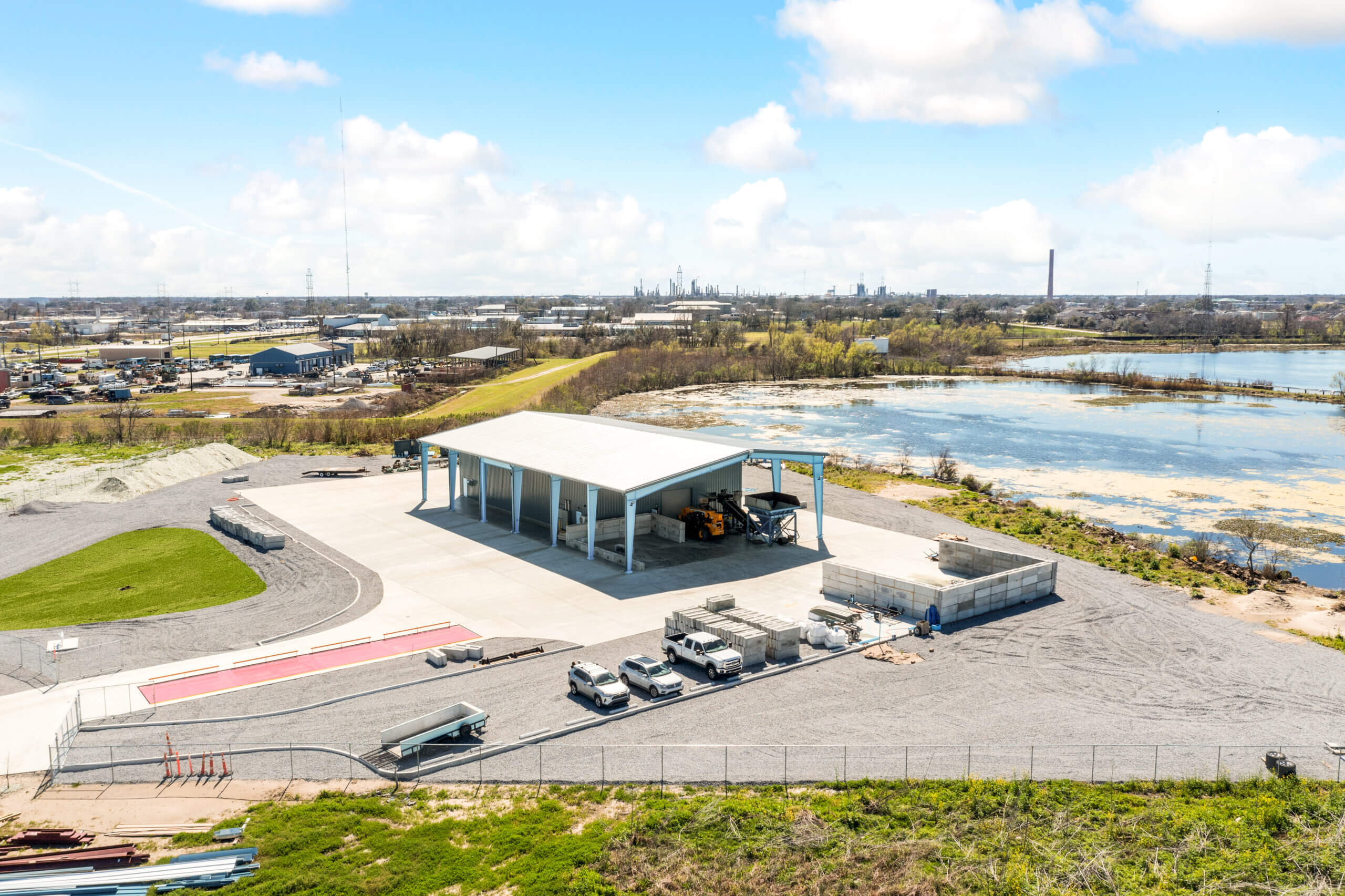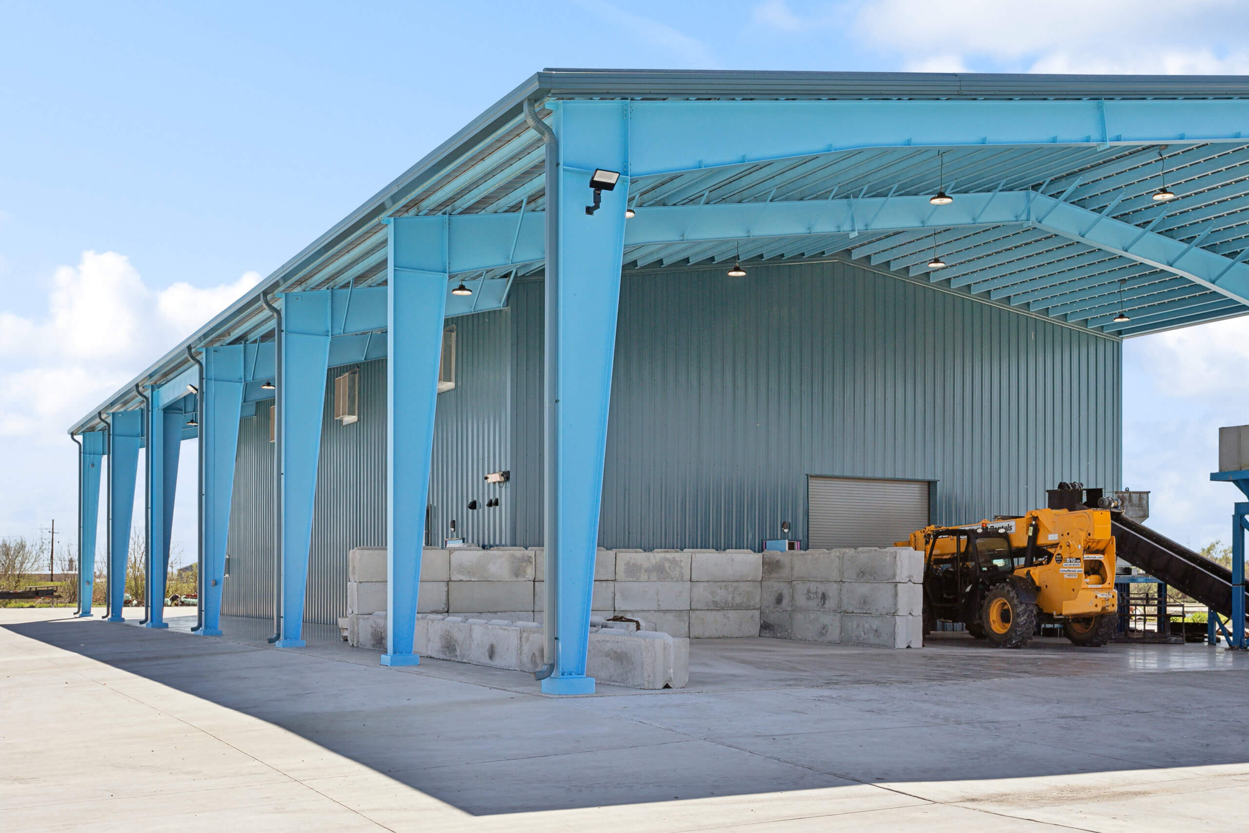 GHF’s new warehouse facility is located on the recently built Treasure Street in Chalmette, Louisiana. The project features a 135-foot by 75-foot NUCOR metal warehouse, installed by RNGD’s Steel Team, with a wall panel enclosure and dedicated awnings for drop-off areas. Separate areas will accommodate residential and pedestrian traffic as well as larger commercial drop-offs. Beyond the processing area, the warehouse includes two offices, a conference room, break room, locker room, and restroom facilities. Before transforming this former dumping ground, RNGD’s team worked to clear old debris above and below the surface. The project is a collaborative effort with architectural design by Williams Architects, structural and civil engineering design by Morphy, Makofsky, Inc., HG Engineering LLC for the HVAC and plumbing design, and Cambas Electric for electrical design.